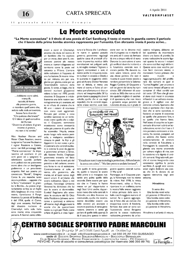 ''La morte sconosciuta'' è il titolo di una poesia di Carl Sandburg. Il testo ci mette in guardia contro il pericolo che il lancio della prima bomba atomica rappresenta per l'umanità. Con sferzante ironia il poeta scrive...