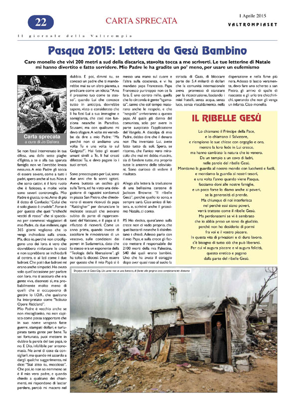 Pasqua 2015: Lettera da Gesù Bambino ( VERSIONE TESTUALE )Se non fossi intervenuto in tua difesa, una delle sette piaghe d’Egitto, a te e alla tua sparuta famiglia non ve l’avrebbe levata nessuno. A mio Padre gli tocca di essere severo, come a tutti i padri, spero anche al tuo. Non è che sono cattivi, è il loro ruolo che è faticoso, e molte volte sono severi controvoglia. Mio Padre è giusto, io no. Amo di più il detto di Confucio: “Colui che è solo giusto è crudele”. Forse è per questo che quei “trichechi vestiti di rosso” che si spacciano per commessi viaggiatori di mio Padre, da due millenni, ogni 365 giorni vogliono che io venga inchiodato sulla croce. Ma, dico io, perché non crocifiggono uno dei loro. é vero che dovrebbero rinforzare le croci e non saprebbero se inchiodarli al centro, o ai lati come i due ladroni. Che poi i due ladroni mi erano anche simpatici. Ho avuto solo quell’occasione per parlare con loro, ma ti assicuro che era gente viva, disonesti sì, ma probabilmente molto meno di quelli che si occupavano di gestire lo I.O.R., che qualcuno ha interpretato come “Istituto Opere Riciclanti”.