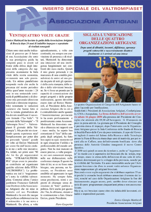 Il 2050 sarà quindi un anno da ricordare e, anche se” leggermente” in ritardo con le aspettative dei bresciani che da tempo, troppo tempo, erano in attesa della definizione di una serie di infrastrutture determinanti per lo sviluppo della provincia, nonché per la vivibilità del Territorio. Un anno memorabile anche per l'Artigianato bresciano che d'ora in avanti vedrà un'unica Organizzazione rappresentare gli artigiani bresciani.
